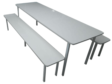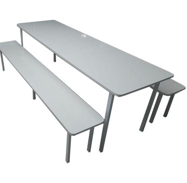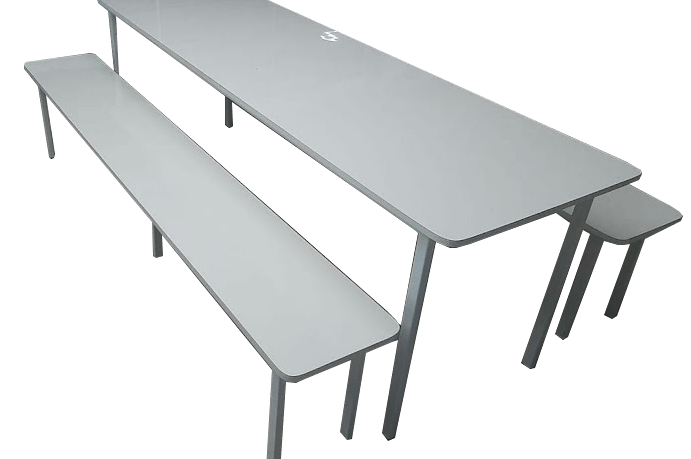 Otimização de Espaço e Higiene: Conjunto de mesa longa de refeitório com bancos integrados fixos, desenhado para otimizar o espaço e acomodar um grande número de pessoas. O tampo é revestido em Fórmica ou MDF, ambos materiais duráveis e de fácil higienização, essenciais para ambientes de alimentação. Sua estrutura metálica reforçada garante total segurança e estabilidade.