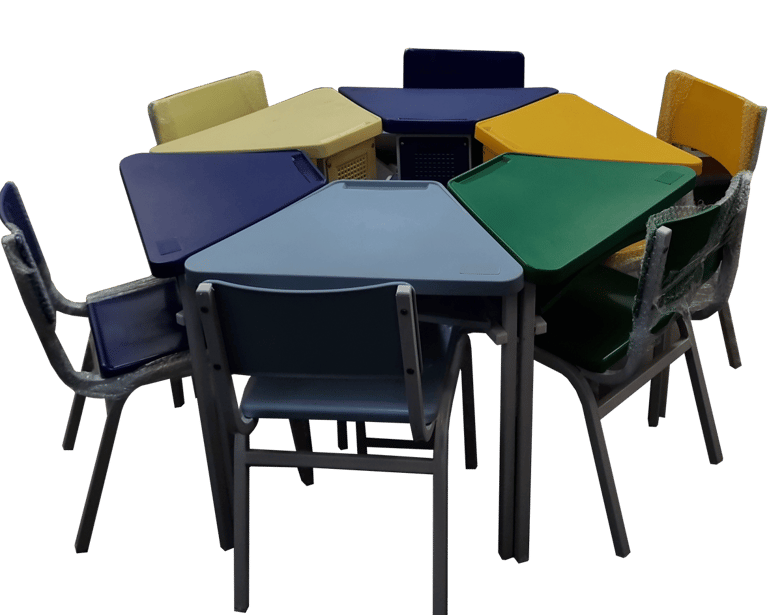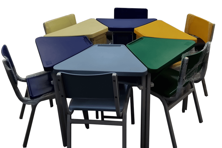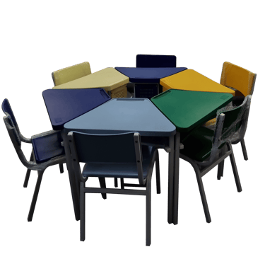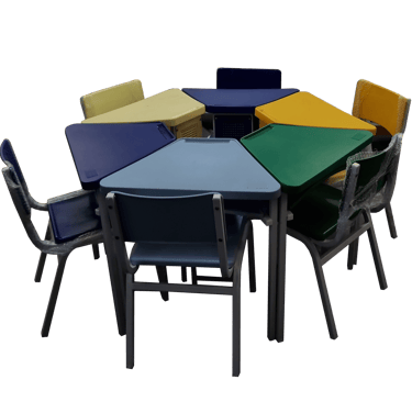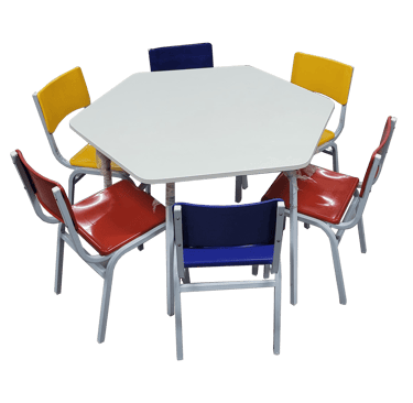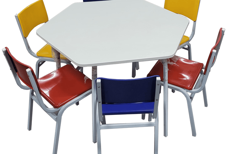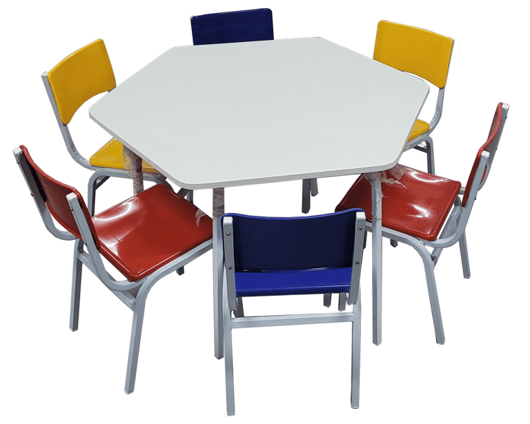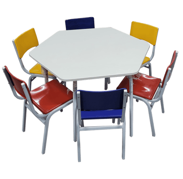 Resistência com Design: Conjunto hexagonal de 6 lugares com tampo em fórmica e cadeiras coloridas. Oferece uma superfície de trabalho estável e durável, com estrutura metálica de alta firmeza, ideal para refeitórios e salas de atividades.