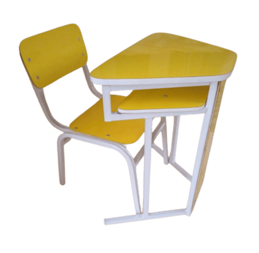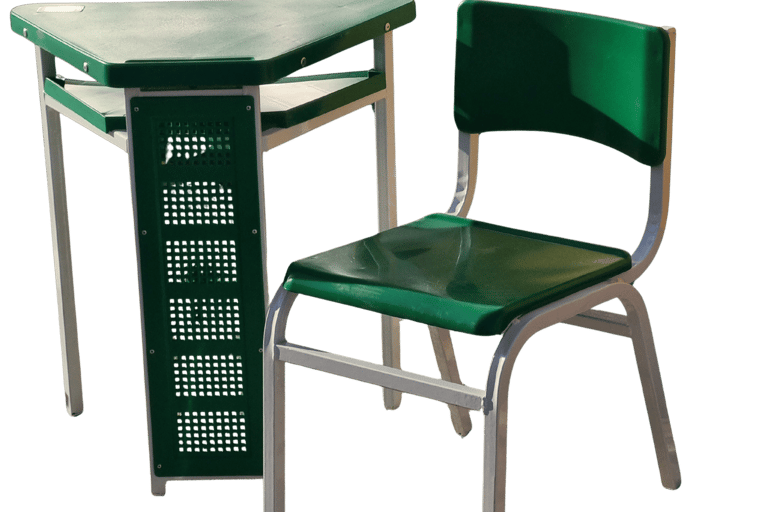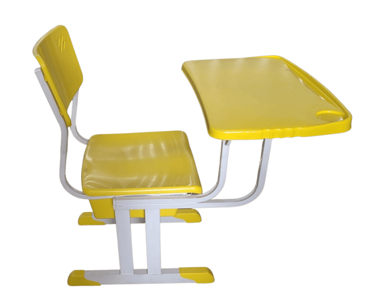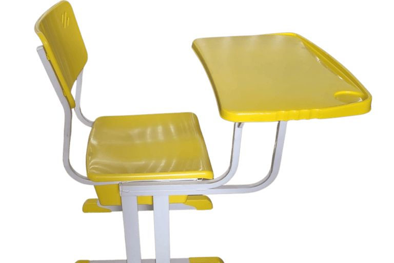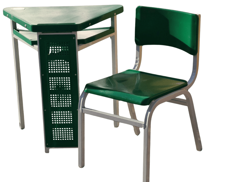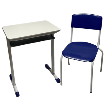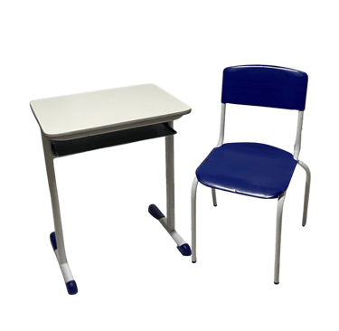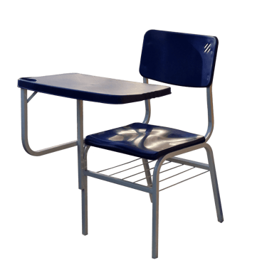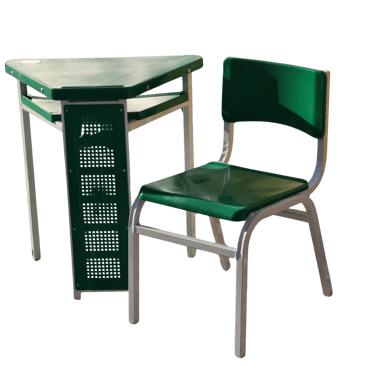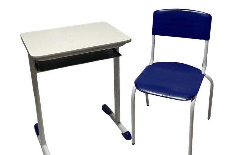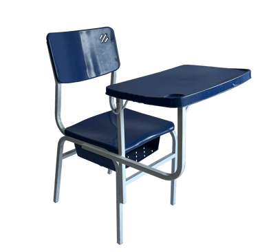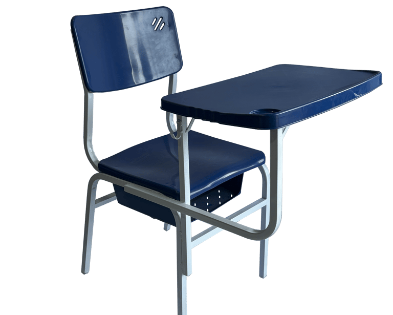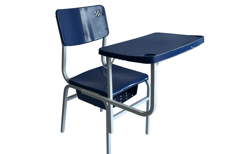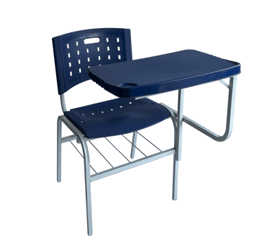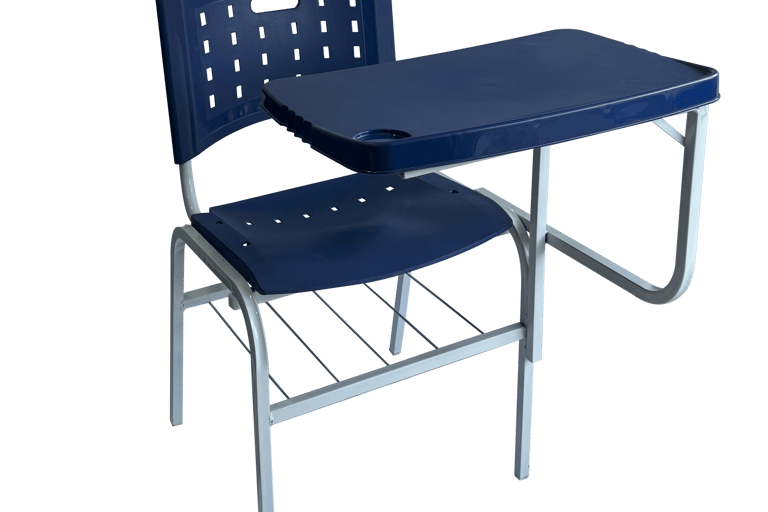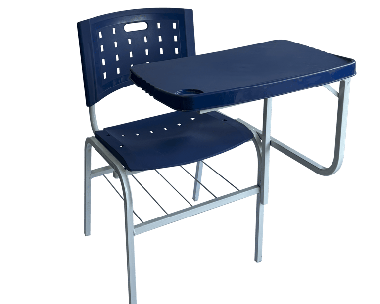 Padrão e Resistência: Cadeira frontal tradicional com prancheta fixa. Conta com porta livros em aramado de alta durabilidade e estrutura simples, porém robusta, sendo uma opção clássica e confiável para o ambiente escolar.
